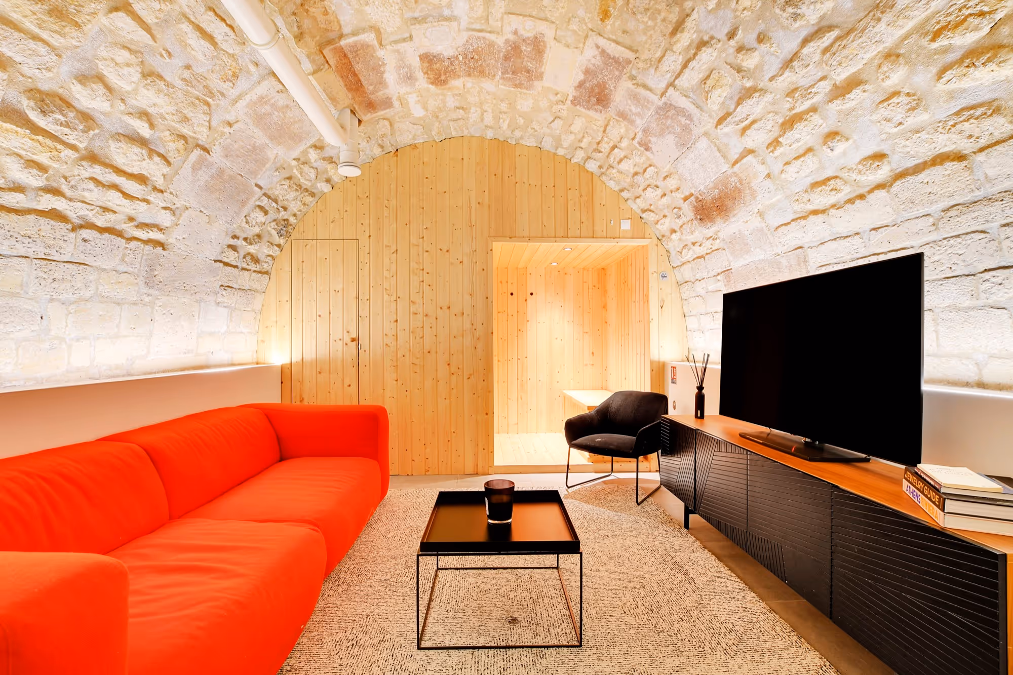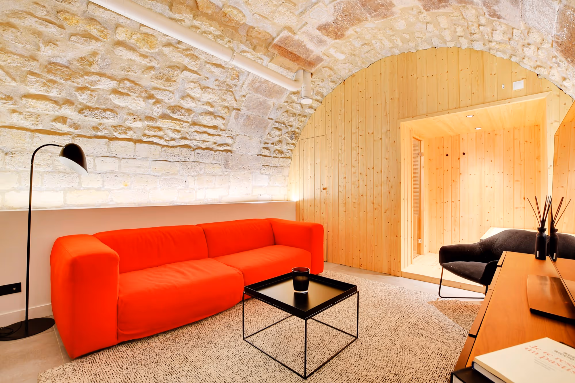 Ce bel appartement de 52 m² est situé au rez-de-chaussée d'une cour calme, au 14 rue de Birague. Idéalement situé au plus près de la place des Vosges, et proche du Marais, il bénéficie d'une localisation exclusive et vous invite à séjourner au plus près de l'activité culturelle de Paris.\n\nIl s'ouvre sur un séjour spacieux, où vous trouverez une télévision connectées, et un canapé convertible pour deux personnes.\nLa cuisine entièrement équipée dispose de tout l'électroménager nécessaire pour un séjour comme à la maison, ainsi qu'un coin repas, idéal pour partager des moments de convivialité, discuter ou travailler.\n\nAu même niveau, la chambre principale est équipée d'un lit Queen-Size ainsi que d'une literie de qualité hôtelière.\nDe l'autre côté du couloir, la salle de bain dispose d'une grande douche à l'italienne et d'un WC.\n\nL'atout majeur de cet appartement, un escalier menant à un étage destiné à la détente. \nComposé d'un coin salon avec un canapé confortable et une grande télévision connectée, et d'un superbe sauna où vous pourrez vous détendre après une longue journée de visites.\n\n\nPour un maximum de confort, cet appartement dispose d'un lave-linge séchant, d'un lave-vaisselle, d'un micro-ondes, d'une machine à café Nespresso, et du wifi au débit.\n\n\nNous proposons des options d'arrivée simplifiées :\n\n- Vous pourrez accéder à votre appartement dès qu'il sera prêt. Nous sommes toujours disponibles par téléphone ou par chat si vous avez besoin de quoi que ce soit.\n\n- Nous recommandons également notre option de service de chauffeur premium. Notre chauffeur vous attendra à la sortie avec votre nom et vous conduira directement à l'appartement.\n