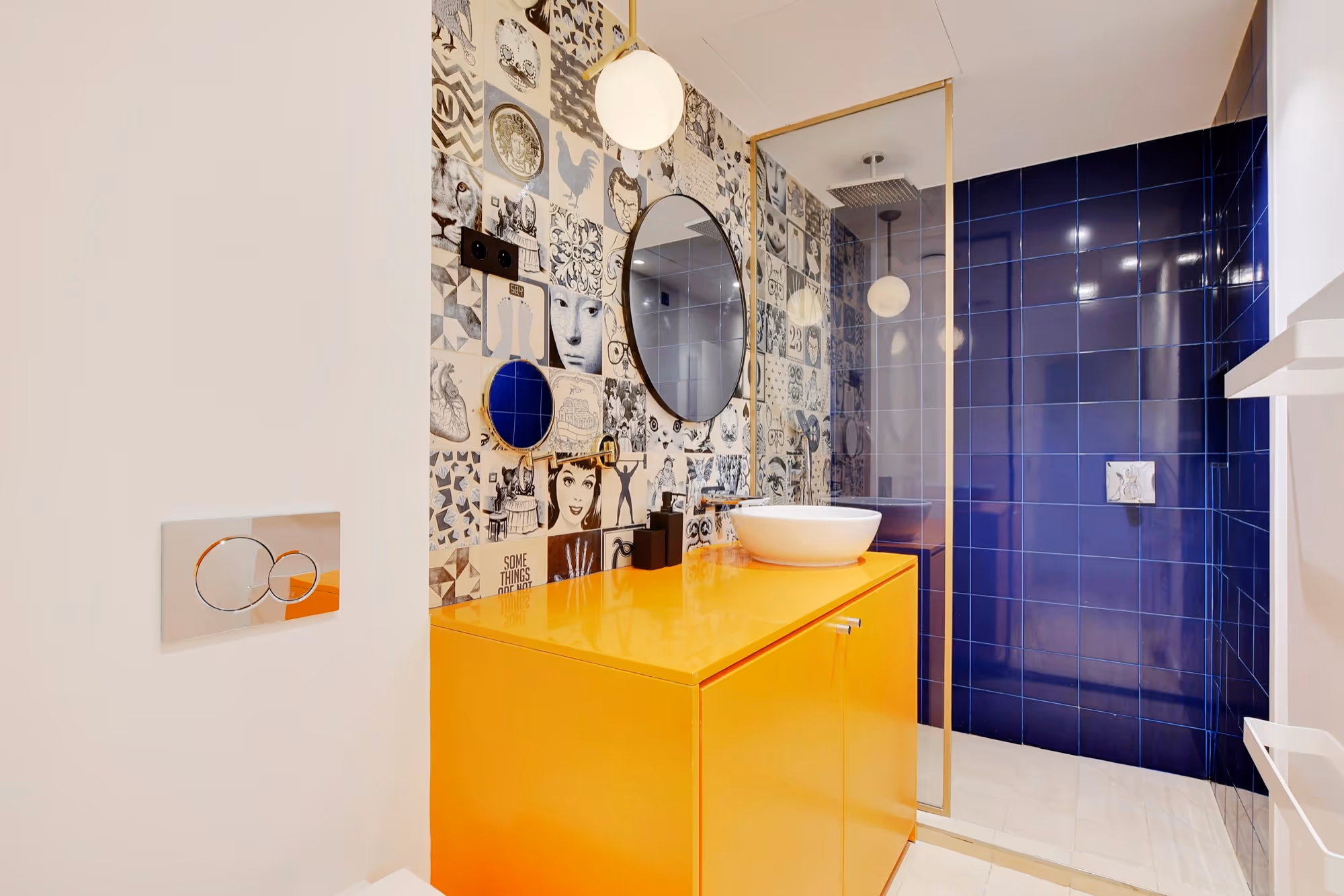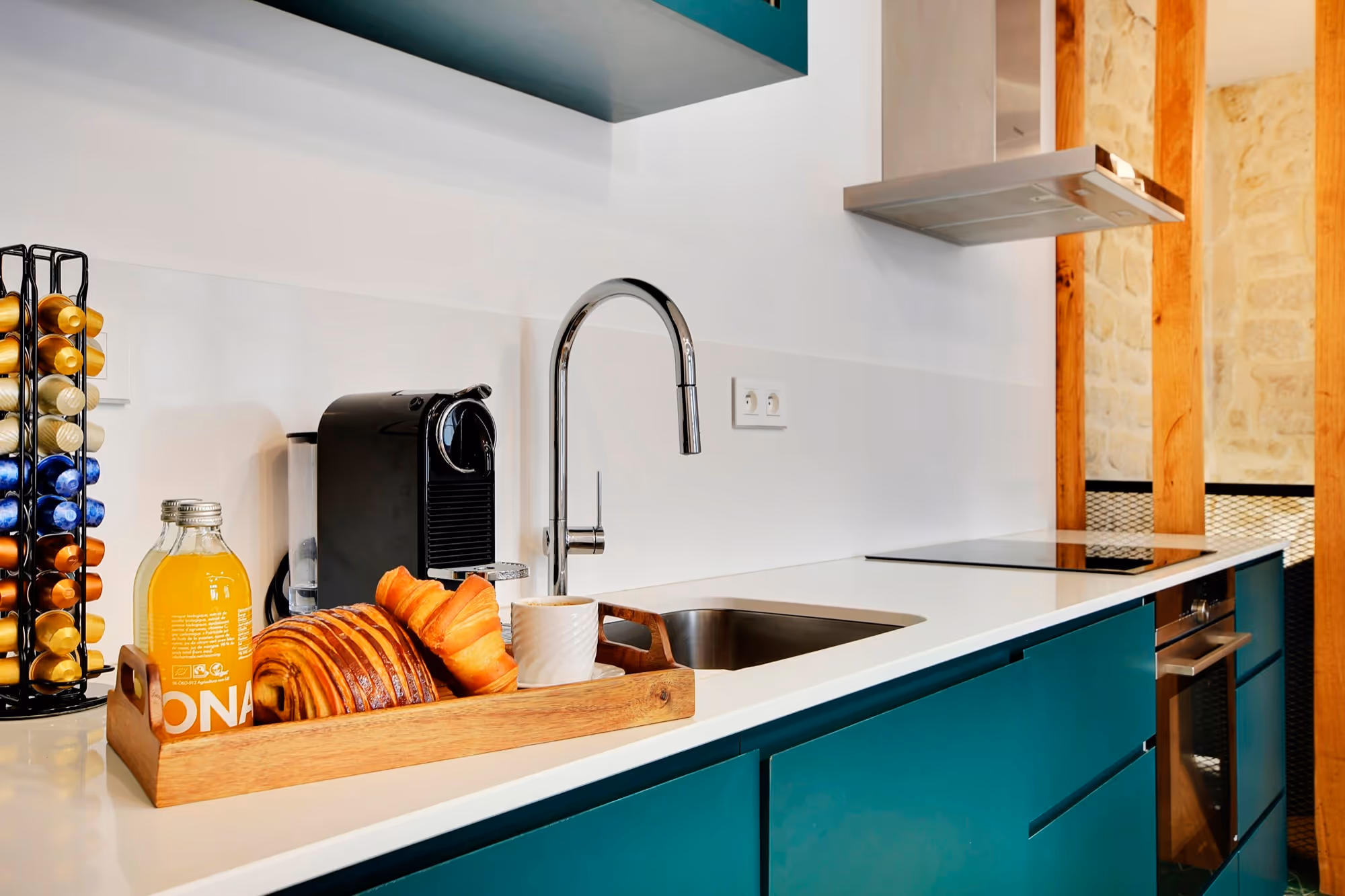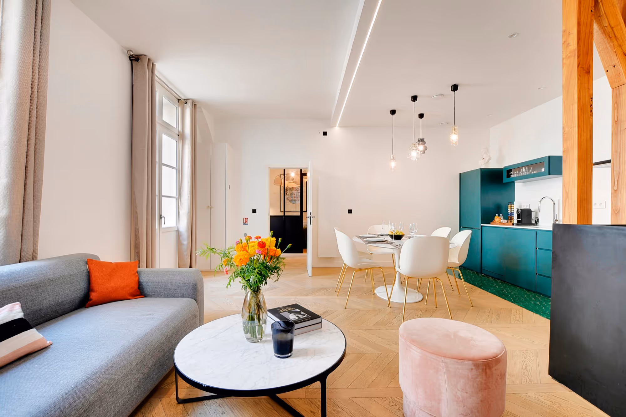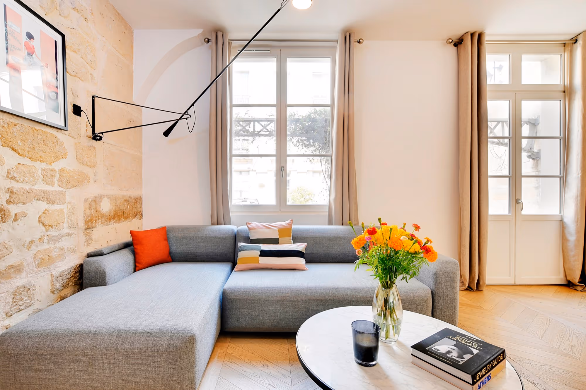 Ce bel appartement de 108 m² est situé au rez-de-chaussée d'une cour calme, au 14 rue de Birague. Idéalement situé au plus près de la place des Vosges, et proche du Marais, il bénéficie d'une localisation exclusive et vous invite à séjourner au plus près de l'activité culturelle de Paris.\n\nIl s'ouvre sur un séjour spacieux, où vous trouverez une télévision connectées, et un canapé convertible pour deux personnes.\nLa cuisine entièrement équipée dispose de tout l'électroménager nécessaire pour un séjour comme à la maison, ainsi qu'un coin repas, idéal pour partager des moments de convivialité, discuter ou travailler.\n\nAu même niveau, la chambre principale est équipée d'un lit Queen-Size ainsi que d'une literie de qualité hôtelière, elle possède sa propre salle de bain attenante avec une grande douche à l'italienne et un WC.\nLa seconde chambre est également équipée d'un lit Queen-Size.\n\nDe l'autre côté du couloir, la seconde salle de bain dispose d'une belle douche à l'italienne et d'un WC.\n\n\nL'atout majeur de cet appartement, un escalier menant à un étage destiné à la détente. \nCette espace exceptionnel est composé d'un coin salon avec un canapé confortable et une télévision connectée, ainsi que d'un espace bar avec une cave à vin et un petit réfrigérateur, parfait pour préparer de délicieux cocktails, et d'un beau sauna où vous pourrez vous détendre après une longue journée de visites.\n\nL'appartement possède également son propre home cinéma, équipé d'un vidéoprojecteur et de confortables fauteuils de cinéma vous permettant de profiter des meilleurs films en intimité. \n\n\n\nPour un maximum de confort, cet appartement dispose d'un lave-linge séchant, d'un lave-vaisselle, d'une machine à café Nespresso, et du wifi haut débit.\n\nNous proposons des options d'arrivée simplifiées :\n\n- Vous pourrez accéder à votre appartement dès qu'il sera prêt. Nous sommes toujours disponibles par téléphone ou par chat si vous avez besoin de quoi que ce soit.\n- Nous recommandons également notre option de service de chauffeur premium. Notre chauffeur vous attendra à la sortie avec votre nom et vous conduira directement à l'appartement.