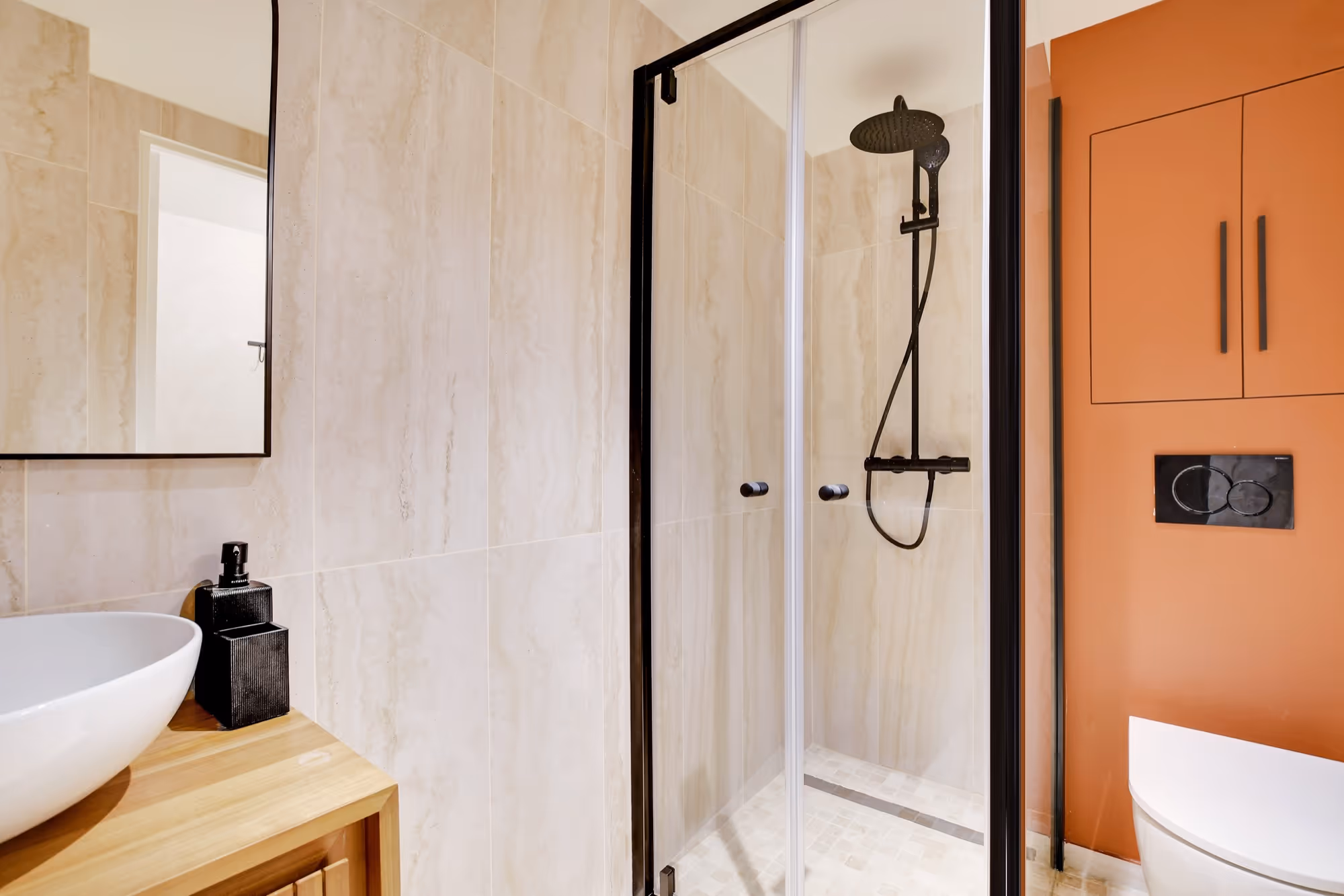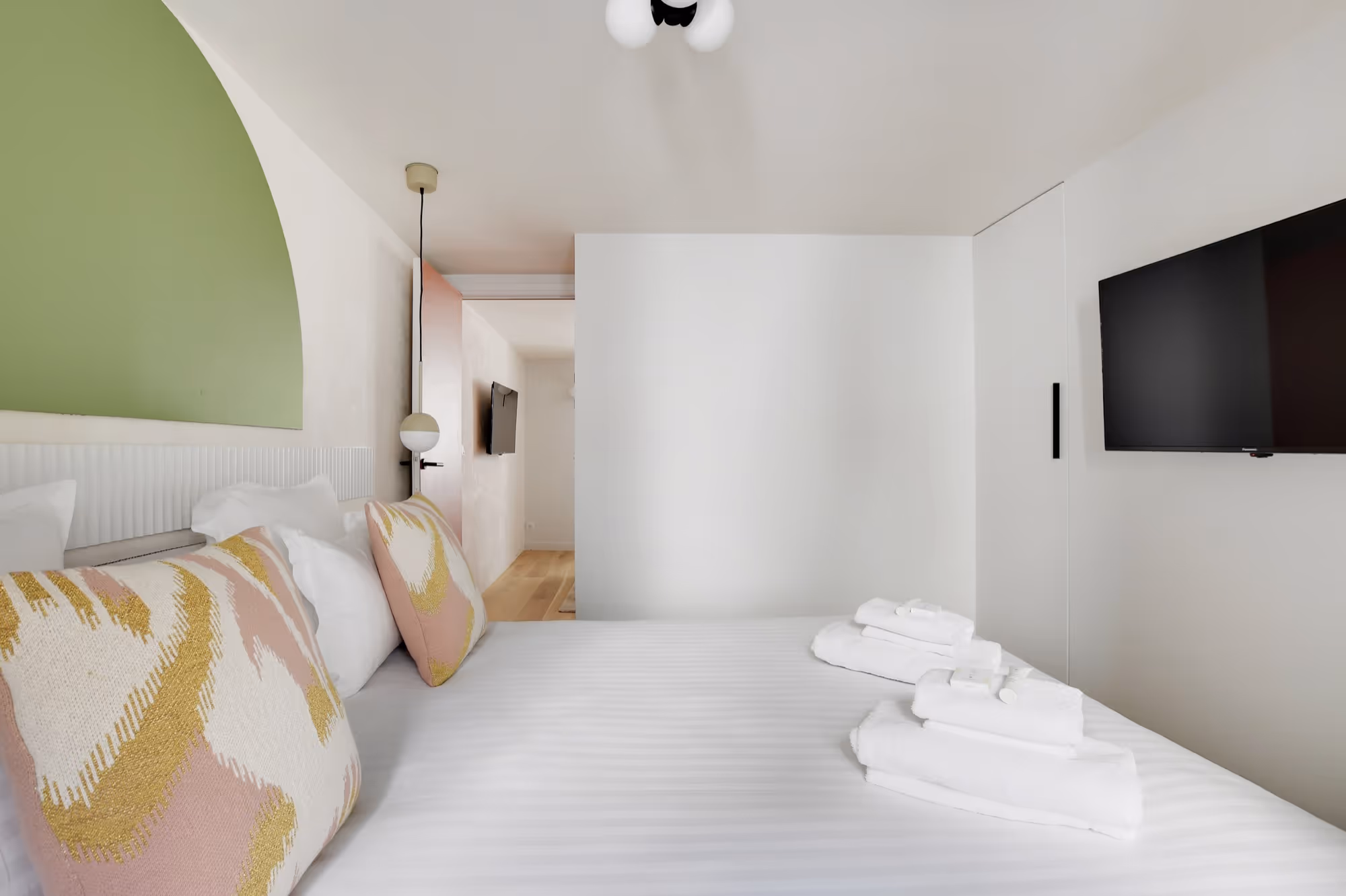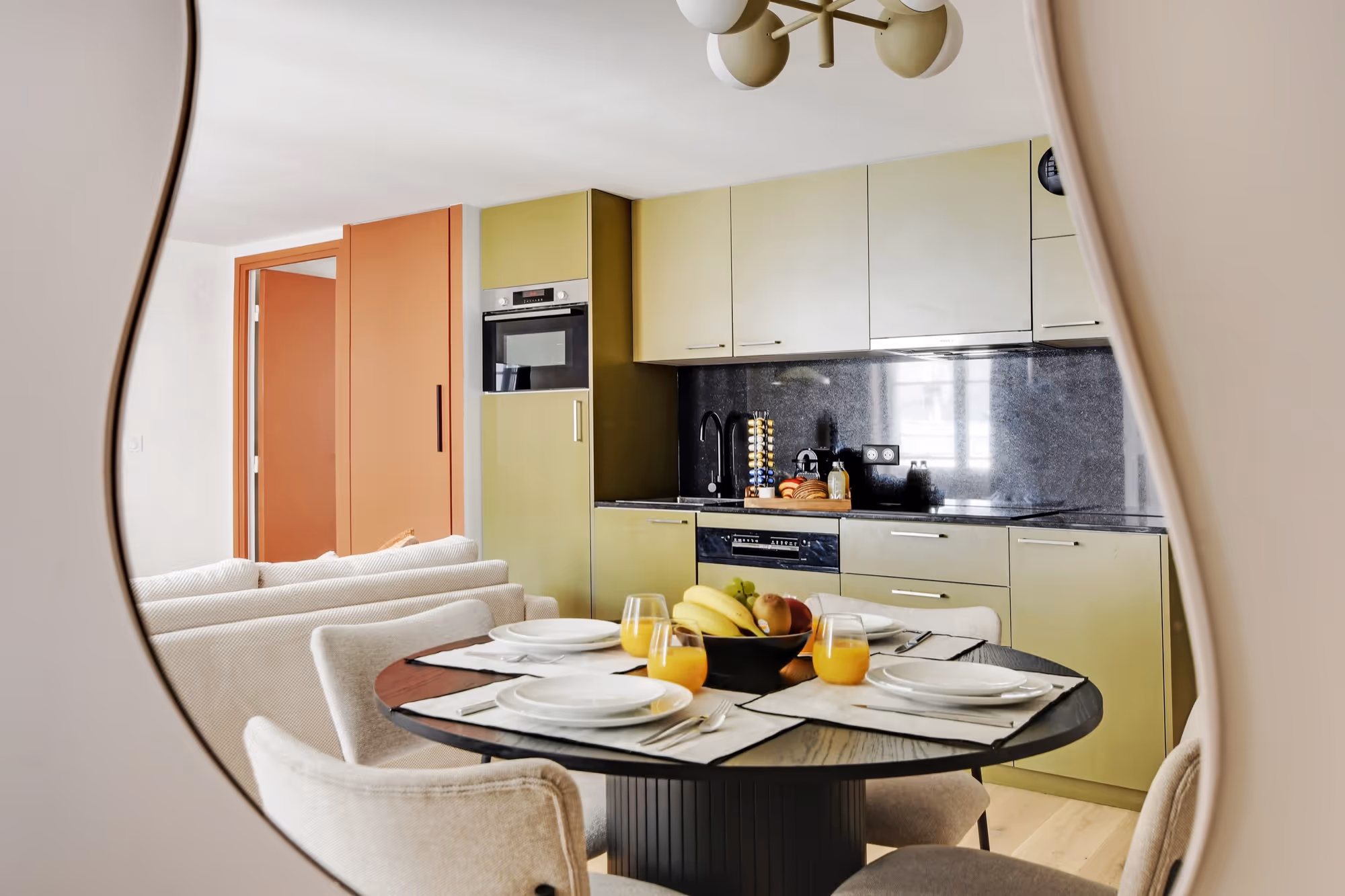 Au 5ème étage, sans ascenseur, cet appartement lumineux de deux chambres, possède un design chic et moderne, et dispose de tout le confort nécessaire pour accueillir 6 personnes grâce à son aménagement optimal. \n\nL'appartement s'ouvre sur une belle pièce à vivre, composée d'un espace repas idéal pour partager des moments de convivialité, d'un coin salon design avec un canapé-lit confortable et une télévision connectée. La cuisine ouverte est entièrement équipée et fonctionnelle. Vous apprécierez le cadre moderne et le mobilier chic et élégant.\n\nLes deux chambres sont équipées de lits Queen-Size avec des matelas de haute qualité pour assurer de bonnes nuits de sommeil, de nombreux rangements, ainsi que de télévisions connectées. \n\nLa salle de bain séparée est composée d'une douche à l'italienne et d'une toilette. \n\nCet appartement dispose, de la wifi haut débit, d’une machine à café Nespresso ainsi que de produits d’accueil. \n\nAttention, veuillez noter que des travaux sont en cours dans l'appartement.\n\nNous proposons des options d'arrivée simplifiées :\n\n- Vous pourrez accéder à votre appartement dès qu'il sera prêt. Nous sommes toujours disponibles par téléphone ou par chat si vous avez besoin de quoi que ce soit.\n- Nous recommandons également notre option de service de chauffeur premium. Notre chauffeur vous attendra à la sortie avec votre nom et vous conduira directement à l'appartement.