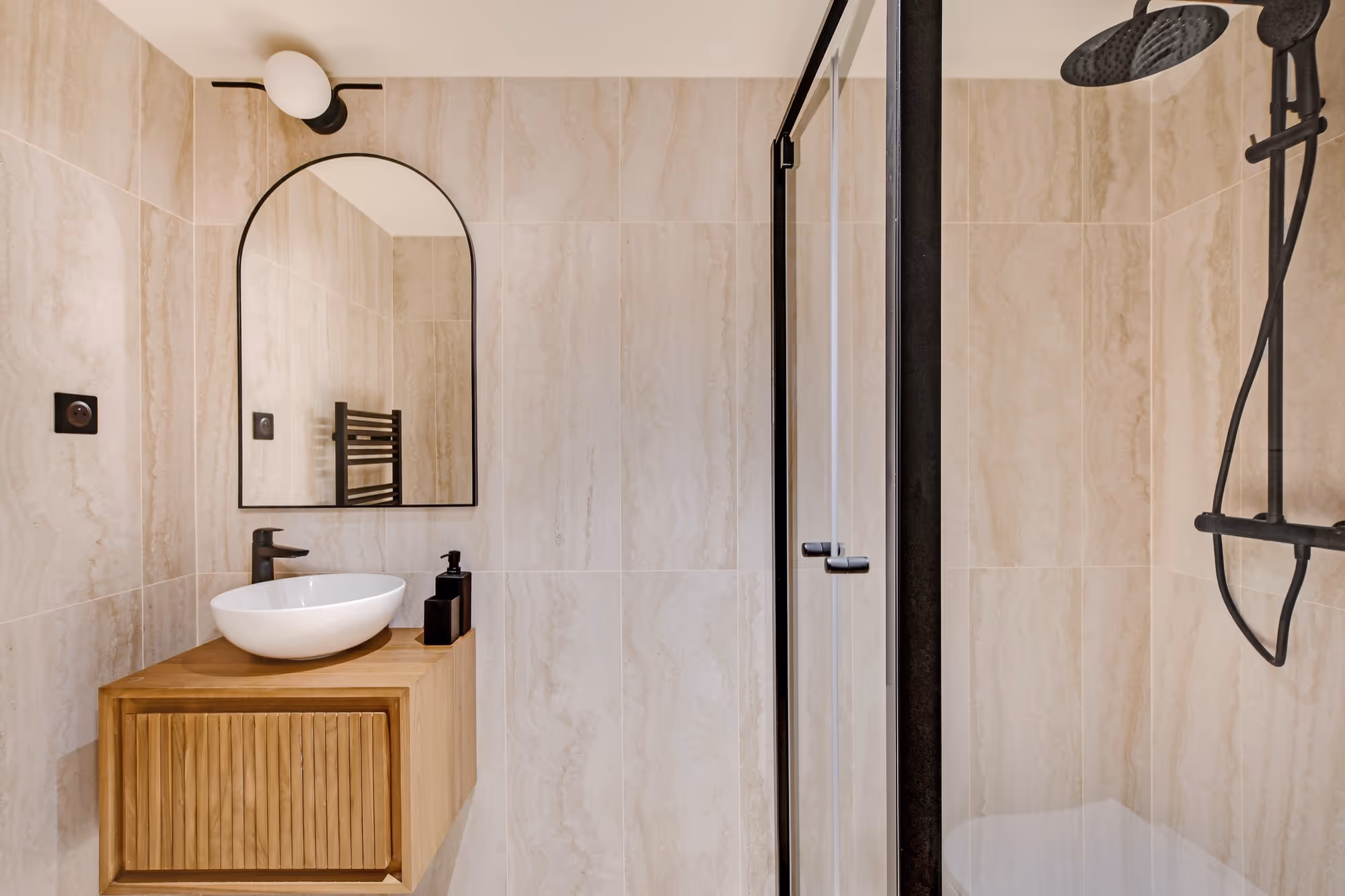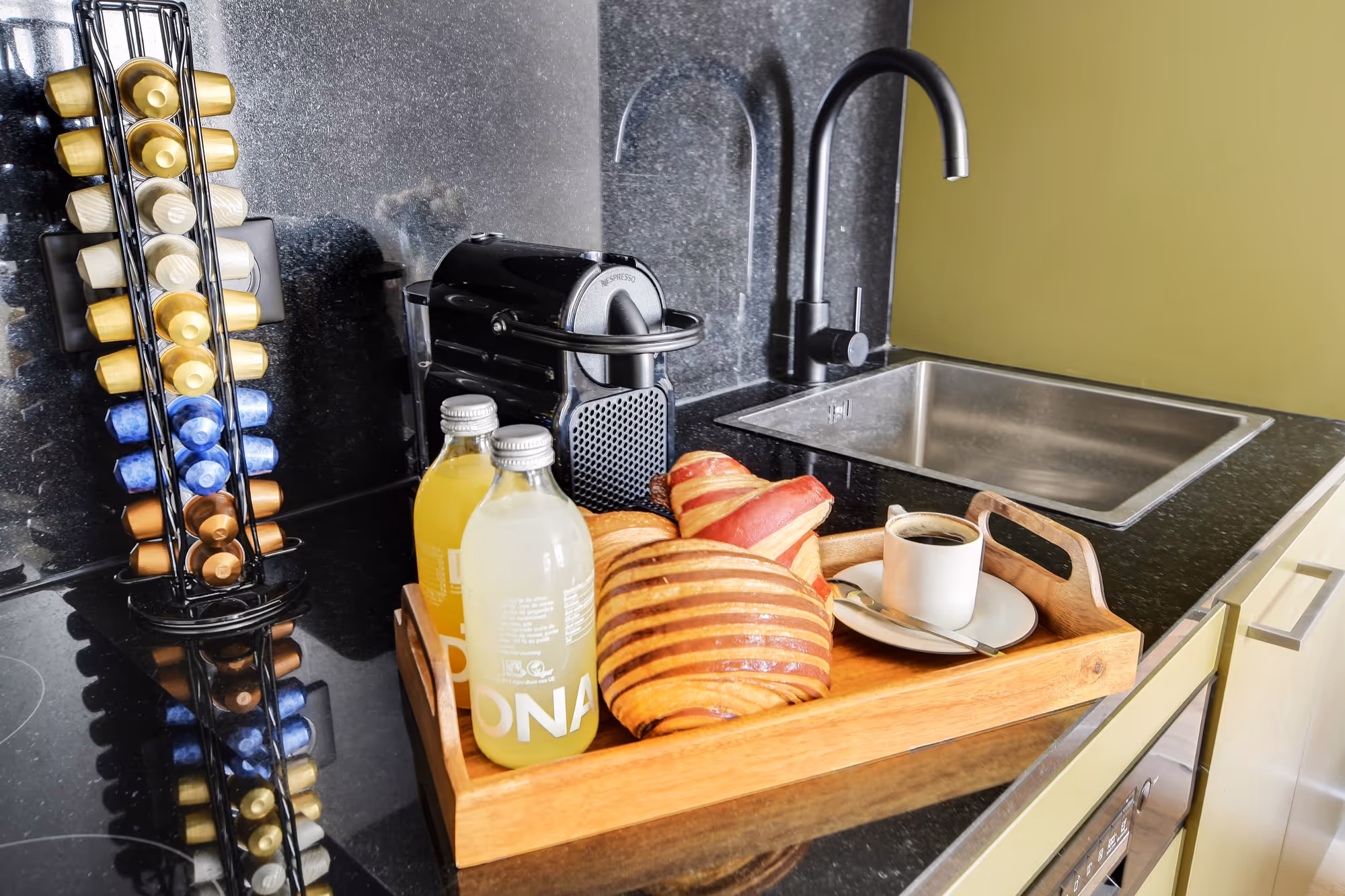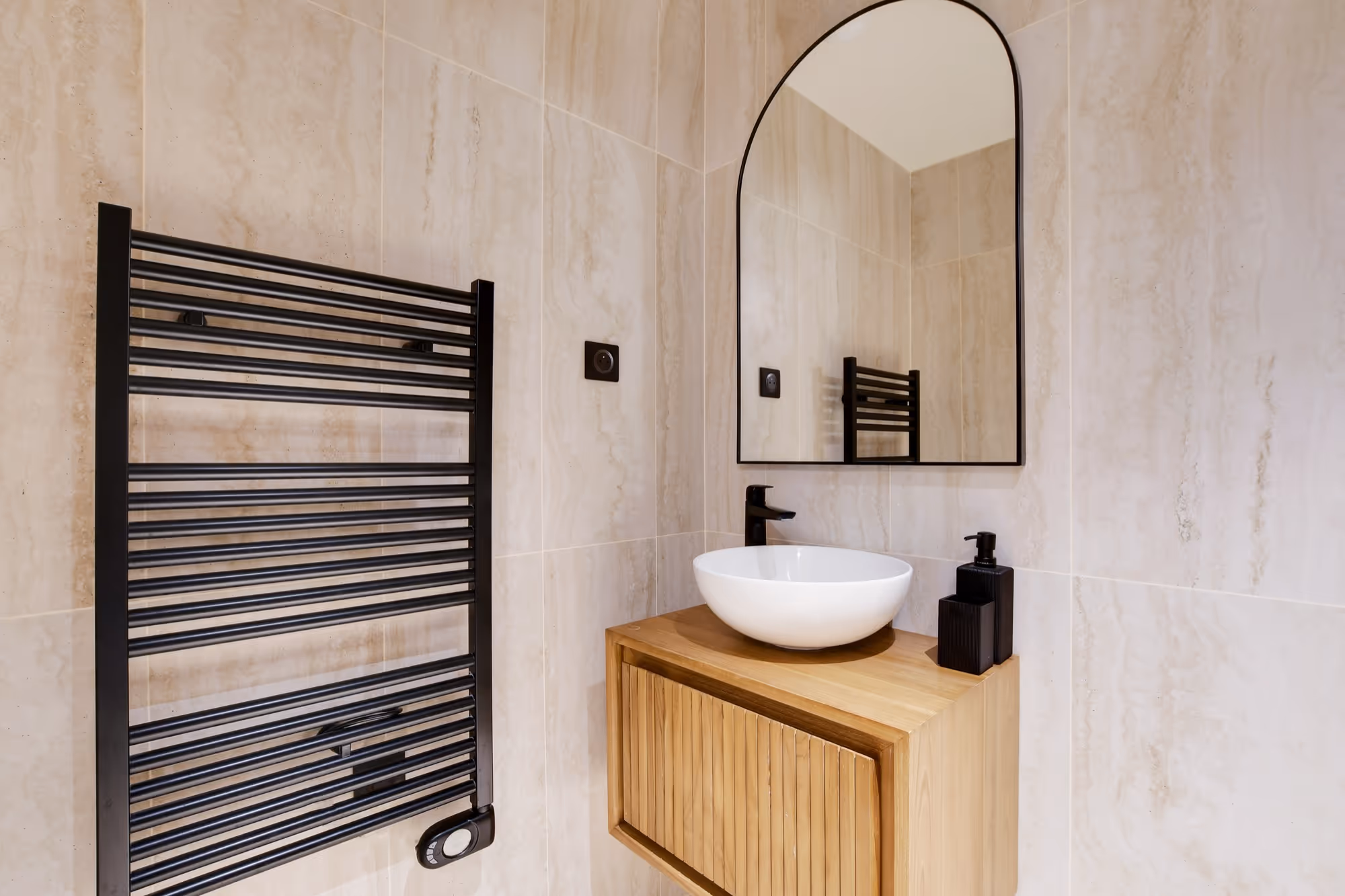 Au 5ème étage, sans ascenseur, cet appartement lumineux de deux chambres, possède un design chic et moderne, et dispose de tout le confort nécessaire pour accueillir 6 personnes grâce à son aménagement optimal. \n\nL'appartement s'ouvre sur une belle pièce à vivre, composée d'un espace repas idéal pour partager des moments de convivialité, d'un coin salon design avec un canapé-lit confortable et une télévision connectée. La cuisine ouverte est entièrement équipée et fonctionnelle. Vous apprécierez le cadre moderne et le mobilier chic et élégant.\n\nLes deux chambres sont équipées de lits Queen-Size avec des matelas de haute qualité pour assurer de bonnes nuits de sommeil, de nombreux rangements, ainsi que de télévisions connectées. \n\nLa salle de bain séparée est composée d'une douche à l'italienne et d'une toilette. \n\nCet appartement dispose, de la wifi haut débit, d’une machine à café Nespresso ainsi que de produits d’accueil. \n\nAttention, veuillez noter que des travaux sont en cours dans l'appartement.\n\nNous proposons des options d'arrivée simplifiées :\n\n- Vous pourrez accéder à votre appartement dès qu'il sera prêt. Nous sommes toujours disponibles par téléphone ou par chat si vous avez besoin de quoi que ce soit.\n- Nous recommandons également notre option de service de chauffeur premium. Notre chauffeur vous attendra à la sortie avec votre nom et vous conduira directement à l'appartement.